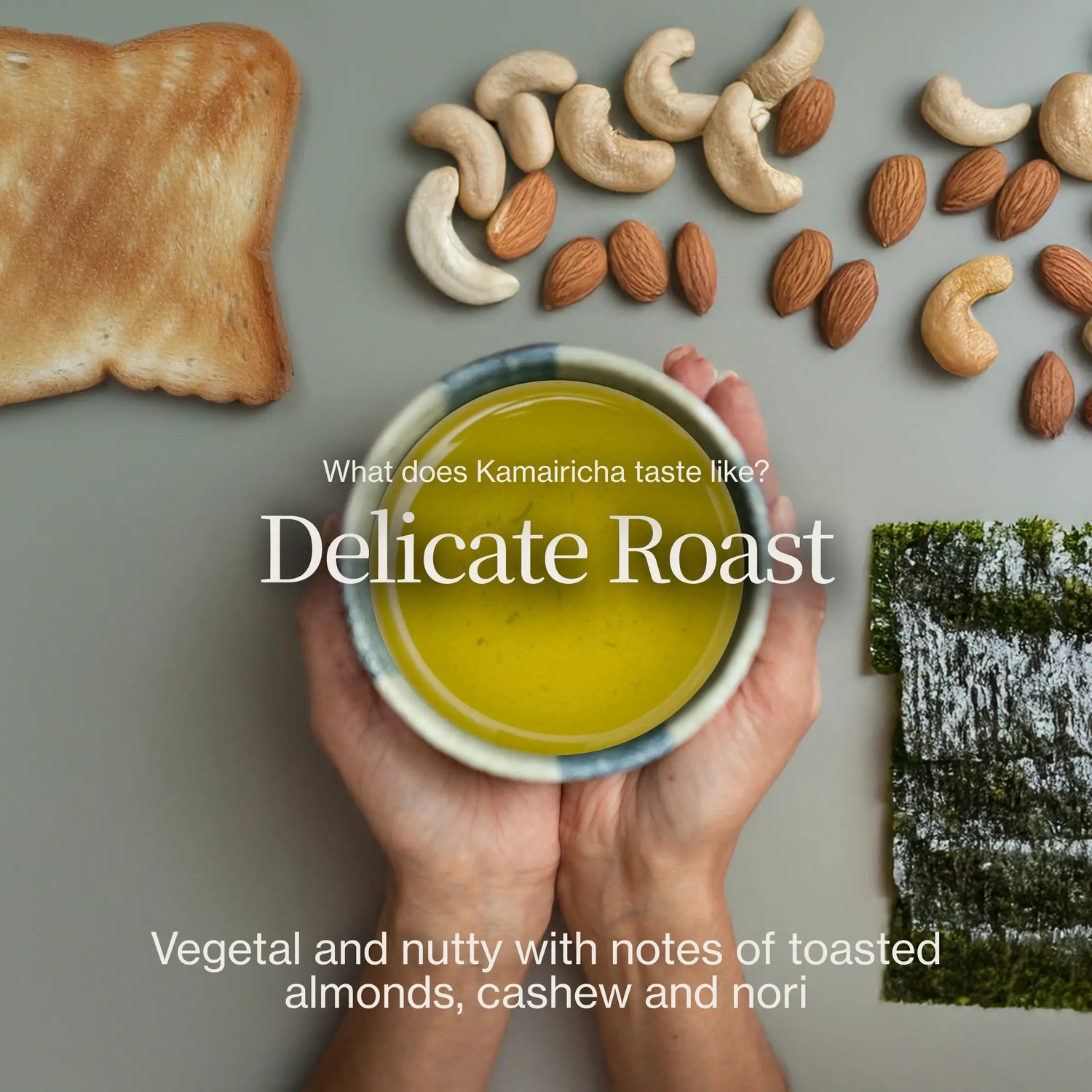 La saveur du Kamairicha joue davantage sur ces notes de noix, avec des arômes d'amandes, de noix de cajou grillées et d'algues grillées. Ce thé réussit parfaitement à combiner les saveurs chaudes des thés entièrement torréfiés avec les saveurs plus fraîches et plus végétales des thés non torréfiés.