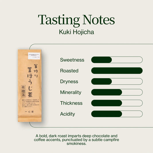 Comparé à d'autres hojichas, un kuki hojicha torréfié foncé se rapproche beaucoup plus du café. La couleur brun foncé et les arômes de torréfaction prononcés vous rappelleront une tasse de café noir bien corsé, mais ce thé est en fait très pauvre en caféine. Il peut être un bon moyen de se détendre après une longue journée, surtout si vous êtes resté à l'extérieur pendant les mois les plus froids. Ce thé est un excellent moyen de se réchauffer en hiver, mais il se prête aussi étonnamment bien à l'infusion froide !