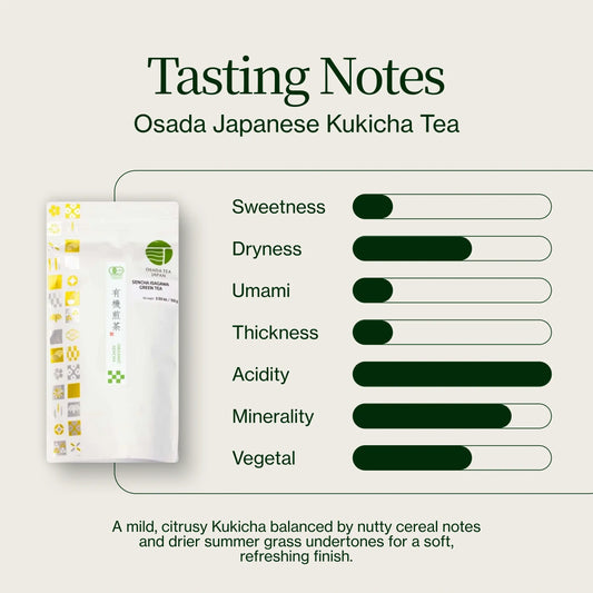 Le thé Kukicha est un thé vert fabriqué à partir des tiges et des feuilles du théier. En mélangeant les tiges au thé, le cultivateur est en mesure de produire un thé à faible teneur en caféine avec un profil de saveur plus doux, semblable à celui du foin ou de la paille. Ces thés ont tendance à être plus riches en minéraux, et vous pouvez ressentir cette minéralité comme une sensation de picotement en bouche.
