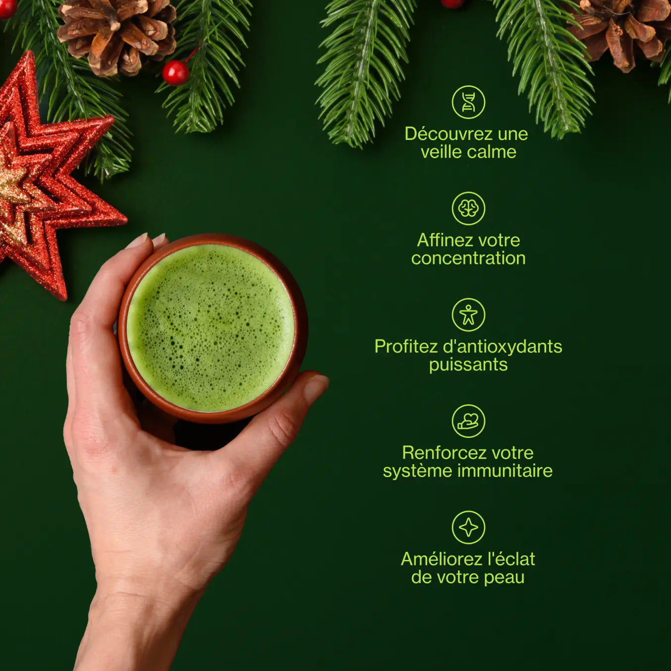 Le matcha regorge de puissants antioxydants, de caféine naturelle et d'acides aminés apaisants qui procurent une énergie durable, une clarté mentale et un sentiment de calme et de concentration. Il favorise le bien-être général, stimule le métabolisme et renforce le système immunitaire, ce qui en fait le complément idéal à votre routine quotidienne ou à vos rituels de vacances.