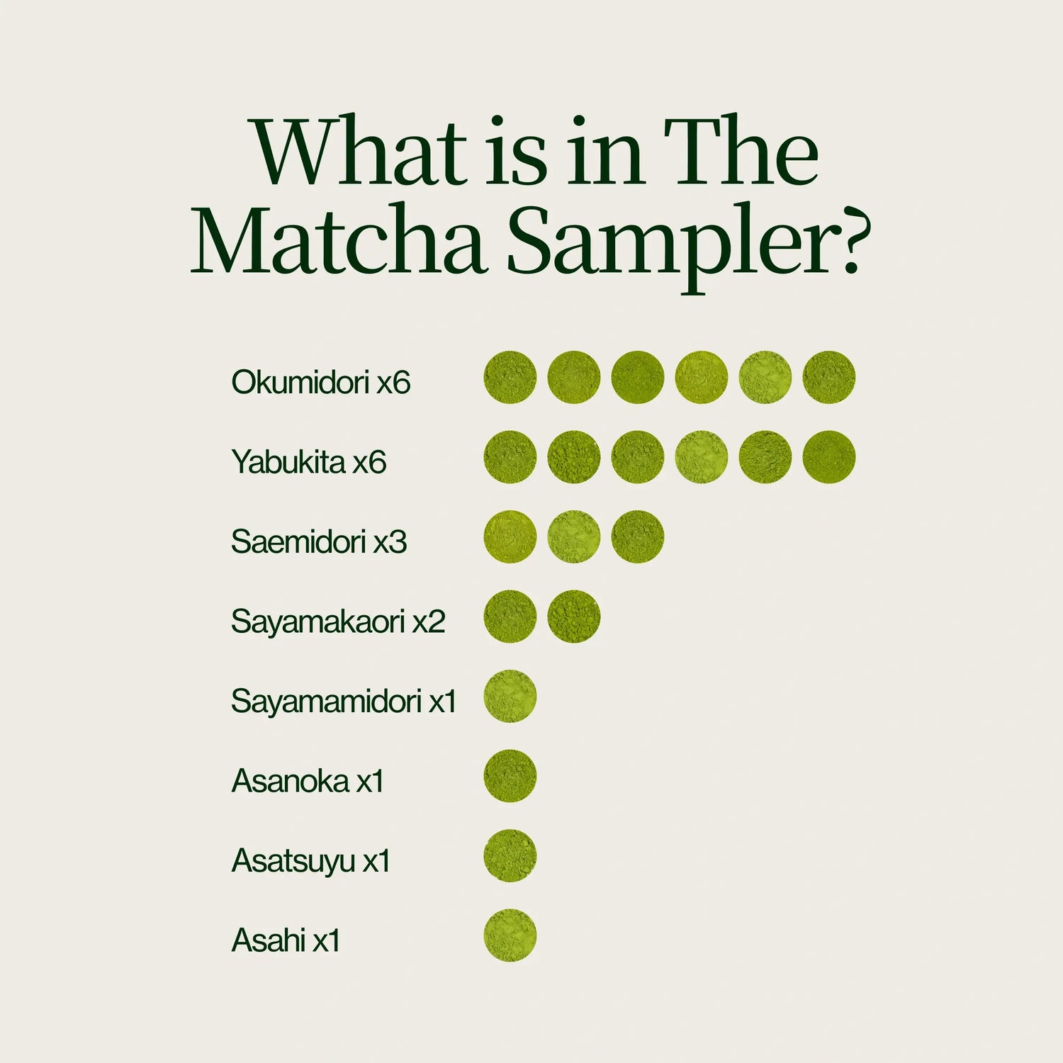 Cet échantillon de matcha présente une sélection de cultivars de matcha, du rafraîchissant Yabukita au savoureux Gokou, en passant par l'onctueux Okumidori, et bien plus encore. Dégustez une sélection de thés matcha pour trouver celui et la région qui vous plaisent le plus. Après avoir sillonné le Japon ces dernières années, nous avons rencontré des dizaines de producteurs et dégusté des centaines de matchas différents afin de vous présenter les meilleurs dans cet échantillon.