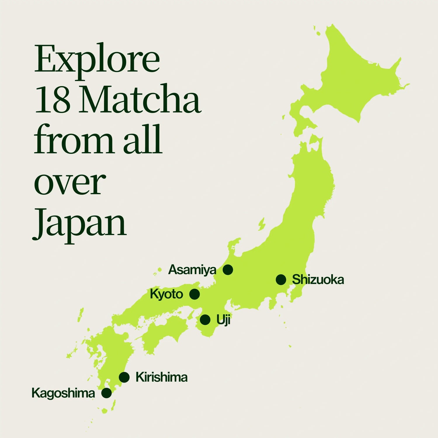Notre matcha est récolté dans six régions de thé japonaises réputées : Miyazaki, Kyoto, Uji, Shizuoka, Kagoshima et Kirishima. Cultivé par neuf petites exploitations familiales dévouées, chaque lot vous offre le goût frais et authentique du Japon, directement dans votre tasse.