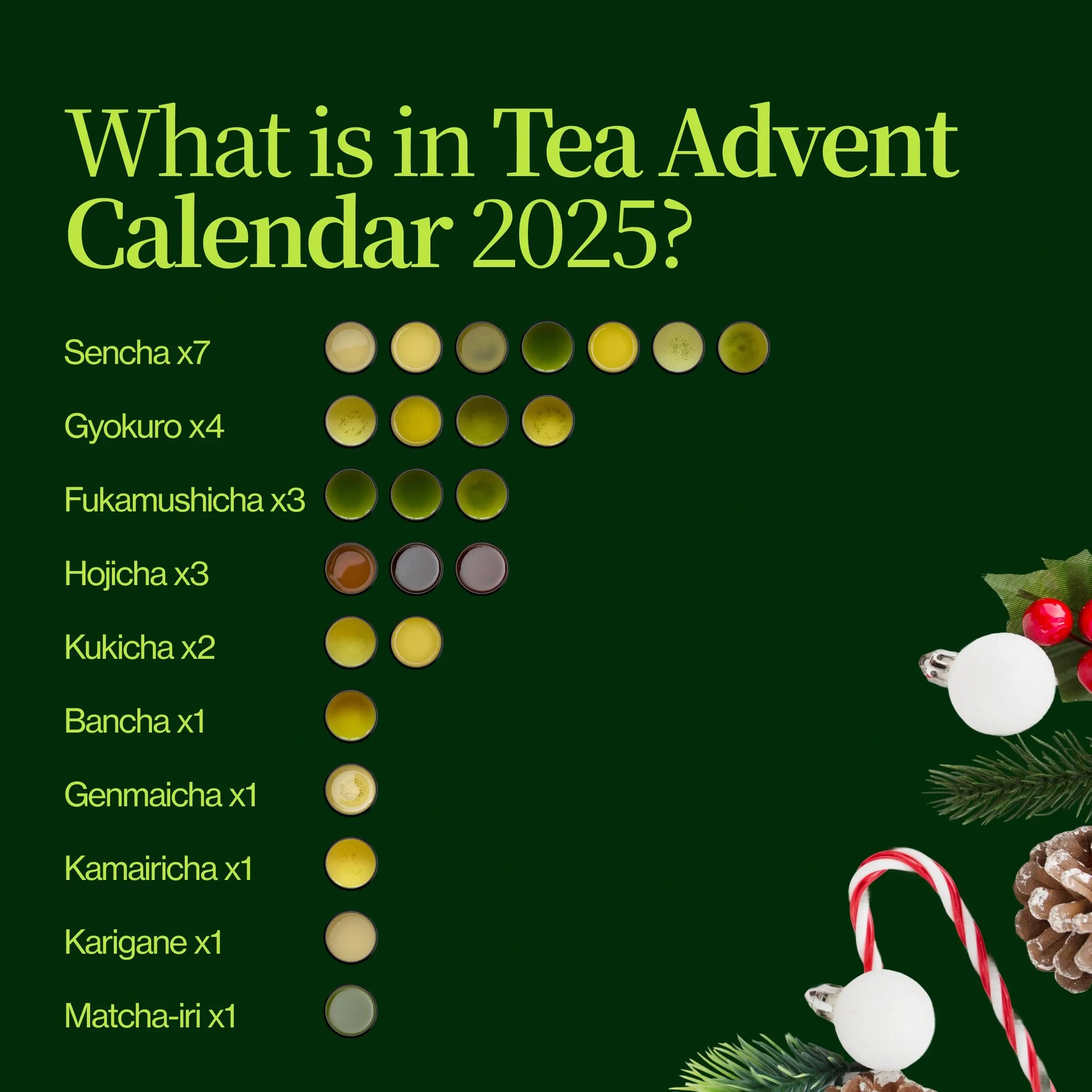 Ce calendrier de l’Avent du thé inclut les thés verts les plus prisés du Japon, tels que le sencha, le gyokuro, le hojicha et bien plus. Vous découvrirez également des variétés uniques comme le fukamushi sencha, le kukicha et le genmaicha, chacune apportant une expérience gustative singulière ancrée dans la tradition japonaise.